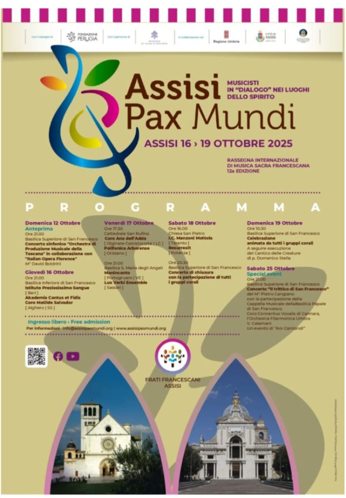 La musica come linguaggio universale di pace: è questo lo spirito di Assisi Pax Mundi 2025, in programma dal 16 al 19 ottobre, che quest’anno celebra il Cantico delle Creature, proponendo concerti e performance collettive che valorizzano il patrimonio culturale e spirituale della città di Assisi.