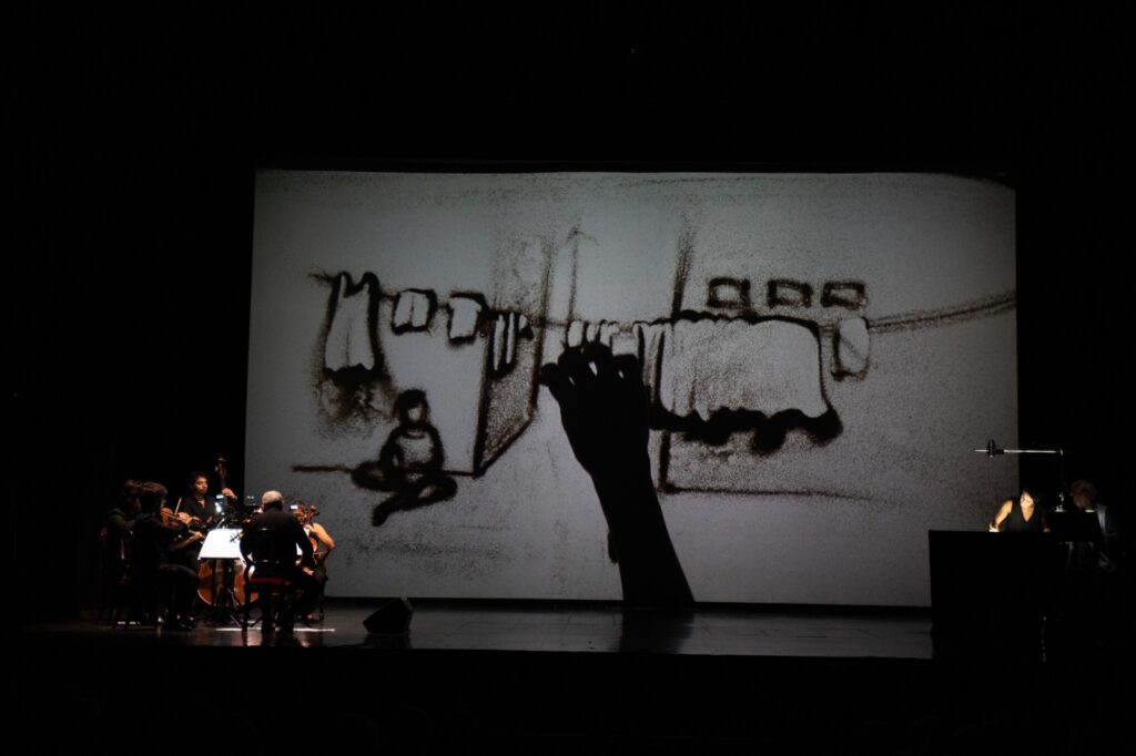 Ladre di sabbia vuole raccontare la storia delle “schiave” di Capoverde con gli strumenti della parola, delle immagini e della musica. Protagoniste del racconto le “visioni” create dal vivo, utilizzando non a caso lo “strumento” della sabbia, da Gabriella Compagnone, una delle artiste di punta di questa tecnica originale e innovativa. Le musiche originali di Marcello Fera intonano per violino e orchestra d’archi le melodie del genere musicale più diffuso dell’isola, portato in tutto il mondo tra gli anni Ottanta e il Duemila dalla voce di Cesària Évora: la morna. L’Orchestra Filarmonica Vittorio Calamani e lo stesso Marcello Fera al violino le eseguono dal vivo, mentre il racconto è affidato alla voce narrante di Guido Barbieri.